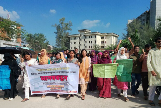 মঙ্গলবার (২১ অক্টোবর) তিস্তা নদীর ন্যায্য পানির হিস্যা ও তিস্তা মহাপরিকল্পনা দ্রুত বাস্তবায়নের দাবিতে জাতীয় কবি কাজী নজরুল ইসলাম বিশ্ববিদ্যালয়ে (জাককানইবি) বিক্ষোভ মিছিল ও মানববন্ধন করেছে রংপুর ডিভিশন স্টুডেন্টস অ্যাসোসিয়েশন। দুপুরে বিশ্ববিদ্যালয়ের জয়ধ্বনি মঞ্চ থেকে বিক্ষোভ মিছিলটি শুরু হয়ে দোলনচাঁপা ও শিউলিমালা হল এবং প্রশাসনিক ভবন প্রদক্ষিণ করে চির উন্নত মম শির প্রাঙ্গণে শেষ হয়। […]